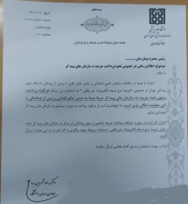 معاون درمان دانشگاه علوم پزشکی تهران تاکید کرد که از پرداخت هرگونه وجه مستقیم با عنوان «جریمه نسخ الکترونیک غیرواقعی» به سازمانهای بیمهگر خودداری شود.