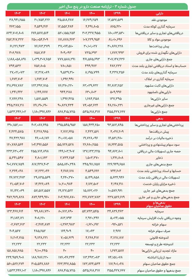 در بخش حقوق صاحبان سهام، جمع حقوق صاحبان سهام از ۸۲۴۷ میلیارد تومان در سال ۱۳۹۸ به ۳۰۶۴۲ میلیارد تومان در سال ۱۴۰۲ رسیده که بیانگر رشد سرمایه و بازدهی بالاتر برای سرمایهگذاران است. همچنین، در طول این مدت، سود انباشته نیز به طور چشمگیری از ۵۲۱۱ میلیارد تومان در سال ۱۳۹۸ به ۱۸۹۸۶ میلیارد تومان در سال ۱۴۰۲ افزایش یافته که حاکی از عملکرد مالی مثبت و حفظ سود در شرکتهای صنعت دارو است. این رشد در سود انباشته و حقوق صاحبان سهام بهویژه نشاندهنده افزایش توانایی صنعت در تامین منابع مالی و بازگشت سرمایه است. در جدول شماره ۳ دادههای ترازنامه صنعت دارو در پنج سال اخیر آمده است.