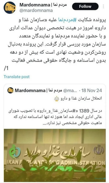 به گزارش فانا، هفته گذشته «مردم‌نما» پلتفرم مطالبه گری و پیگیری مطالبات در اکانت ایکس خبر از شکایت مردم‌نما علیه سازمان غذا و دارو داد و اعلام کرد این پرونده به دنبال روشن کردن وضعیت نهادی است که بیش از دو دهه بدون اساسنامه و جایگاه حقوقی مشخص فعالیت کرده است.