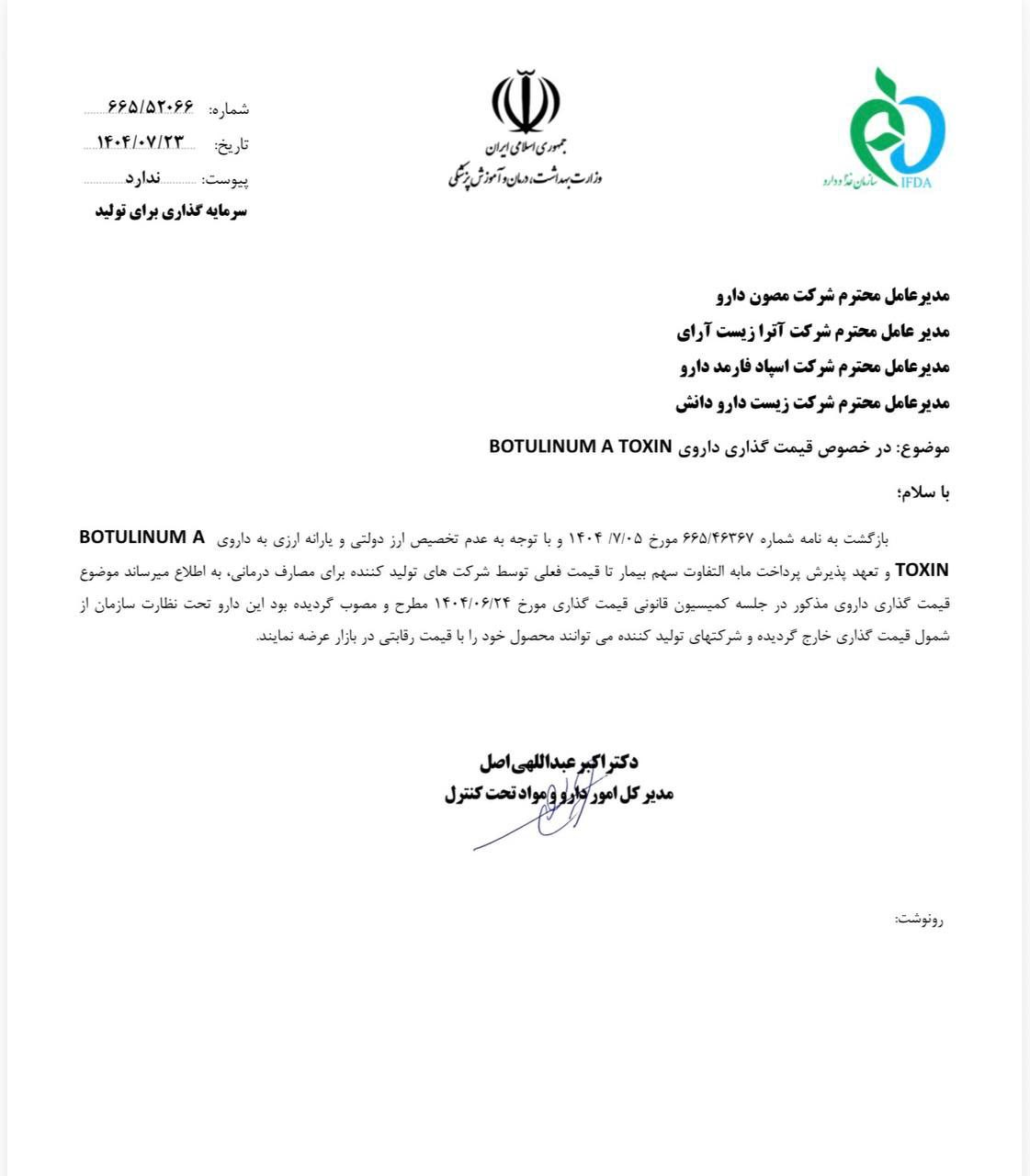 داروی بوتولينوم توكسين نوع A از شمول قیمتگذاری خارج شد