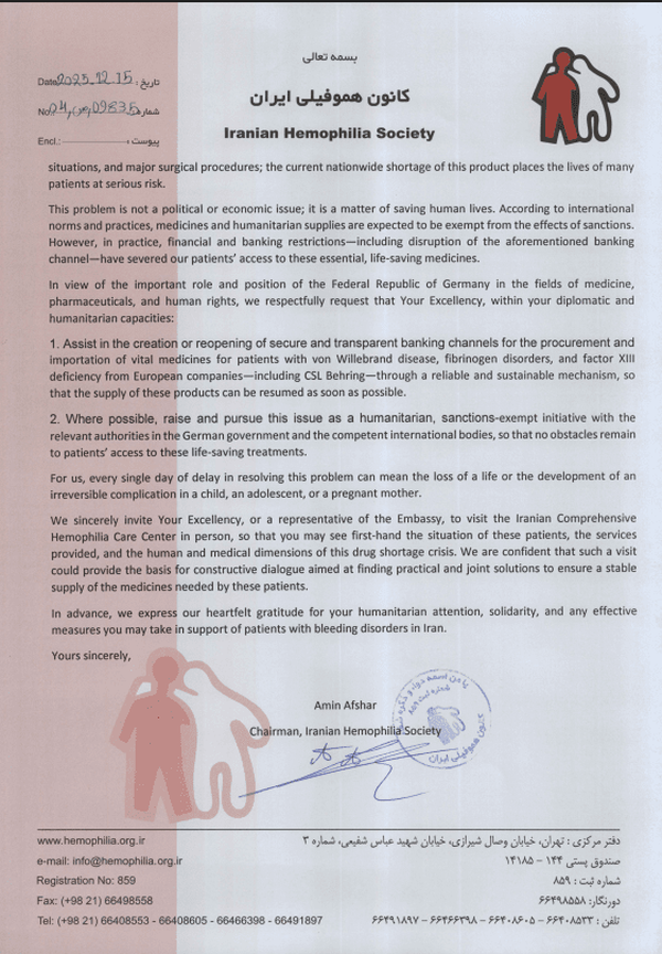 امین افشار،رئیس هیئتمدیره کانون هموفیلی ایران اظهار داشت: کانون هموفیلی ایران در راستای مسئولیتهای انسانی و بینالمللی خود و بهعنوان عضو رسمی فدراسیون جهانی هموفیلی، طی نامهای رسمی خطاب به سفیر آلمان در کشورمان، نگرانی عمیق خود را نسبت به جان و سلامت بیماران مبتلا به هموفیلی، بیماری فونویلبراند، کمبود فیبرینوژن و کمبود فاکتور ۱۳ به سفیر آلمان در تهران منتقل کرده است.